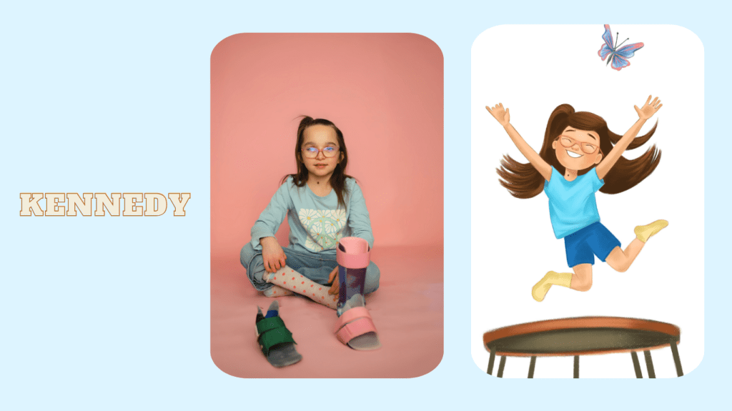 My name is Kennedy! I was born with bilateral club feet and my first two fingers on my right hand were fused together. I also don’t have fully developed toes and no big toes. I have a severe form of bilateral club feet and Streeter’s Dysplasia (a rare disorder affecting 1 in 15,000 live births). As a baby I had full leg serial casting and my parents made weekly trips to Fargo to have my feet stretched and casts changed. At 8 weeks old, I underwent my first surgery where my achilles tendons were clipped. I wore a 23-hour wear boot (with the Ponseti boot and bar) until I was 14 months old. At 4 months old I underwent my second surgery to separate my fingers. At 2 years old I underwent my 2nd hand surgery to deepen the V between my 1st and 2nd fingers. At 2.5 years old, I got my first set of SMO braces with a pad to act as my big toe. About a week later, I walked for the first time! My 4th surgery was a tendon transfer surgery. The surgeons transferred the tendons from the inside of my foot and moved it to the outside, clipped the plantar tendon on the bottom of my foot, and clipped the achilles tendons. They also sewed what they call a “button” on the bottom of the foot to stabilize the transfer of the tendons. They did this on both feet. After this, they stretched the foot out into almost a 90 degree angle away from my body and put me in full leg casts.